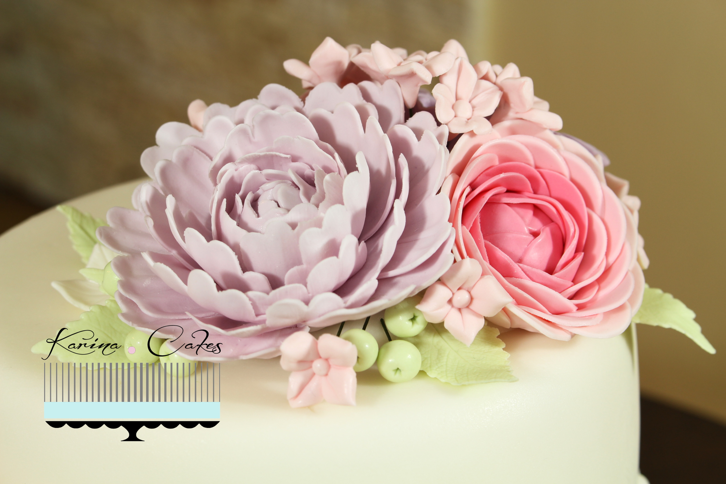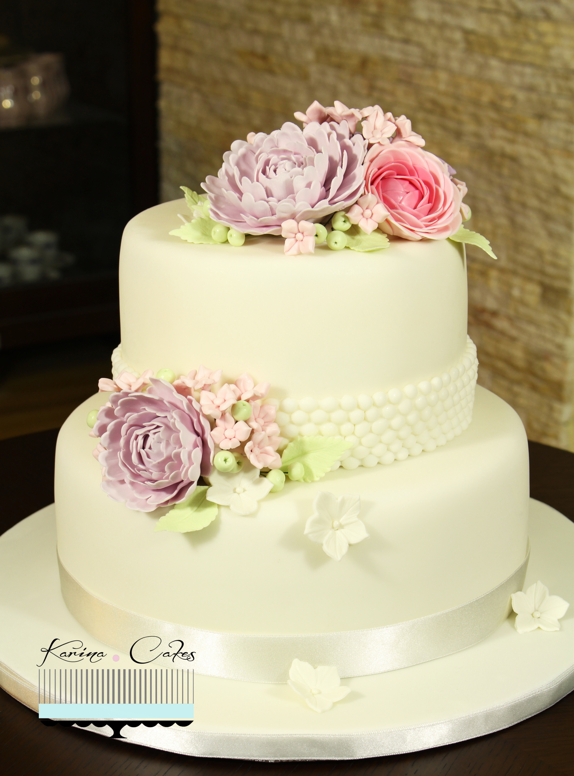 Svadobná torta s pastelovými kvietkami bol darček pre našu kamarátku Zuzku. Mimochodom, práve architektka Zuzka Baranová je autorkou loga Karina Cakes, ktorým ma milo prekvapila. Myslím si, že dokonale vystihla môj štýl a atmosféru sladkej tvorby. Aj ja som preto urobila tortu, ktorá by bola originálna práve pre Zuzku a jej veľký deň.